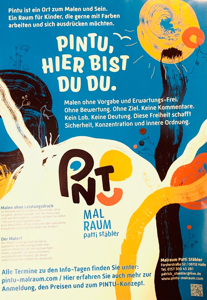 PINTU ist ein geschützter Ort zum Malen und Sein, der eine ungestörte Hingabe an das Farben und Zeichenspiel ermöglicht. Bestimmend, ist das spontane Spiel mit der Farbe im Bildraum auf dem Papier. Mit veganen Pinseln und hochwertigen, brillanten Gouachefarben wird stehend an der Wand gemalt und nach eigenen Vorstellungen die MALSPUR erschaffen.